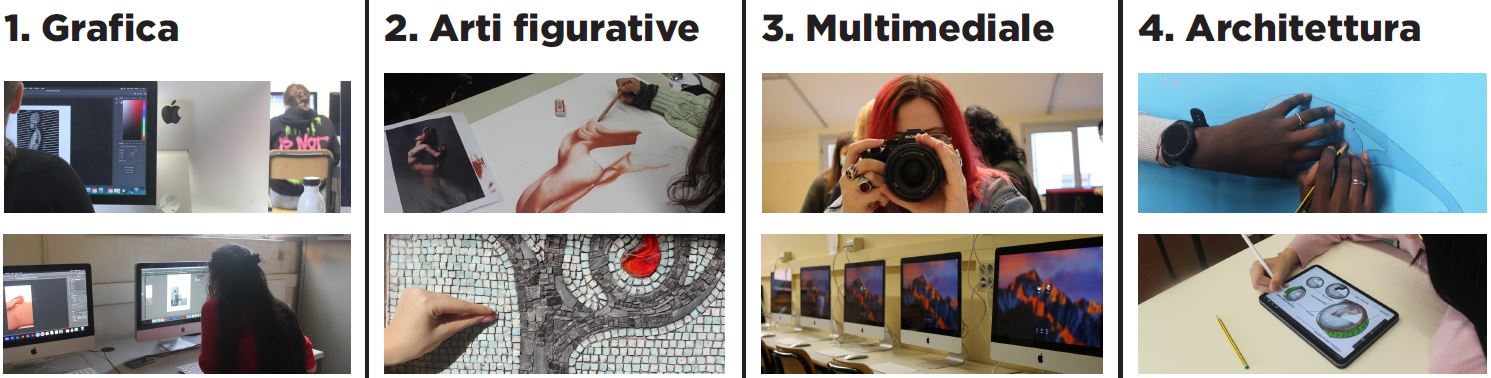 Nel corso di arti figurative, lo studente, attraverso il laboratorio di figurazione, sviluppa la propria capacità progettuale e acquisisce padronanza dei linguaggi delle arti figurative (disegno e pittura, modellazione plastica, mosaico), individuando le interazioni con il contesto architettonico, urbano e paesaggistico; all’interno di questo indirizzo sono previste tre specificità: